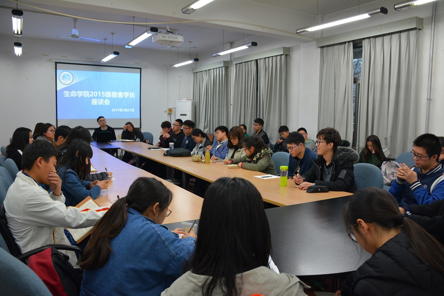 2017年3月21日晚,生命学院2015级宿舍学长座谈会在北校区主教110会议室顺利召开,辅导员老师禅晓蕾、李妍奇出席了本次座谈会。