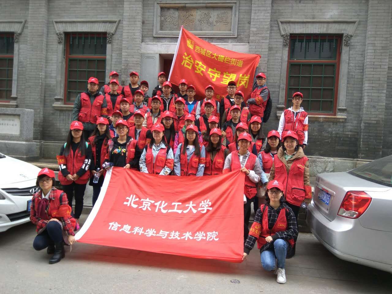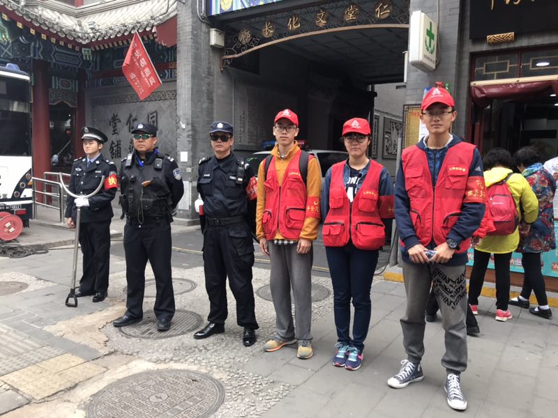 为迎接十九大,北京化工大学信息学院本科生第二党支部发出号召,希望学生党员能够担起维护治安稳定的重任,为十九大的顺利召开献力。学生党员们热情饱满,积极参与到安保活动中,为社区安定和谐献出青年学生的青春力量。拥挤漫长的地铁上,同学们热情昂扬,期待着即将来临的安保工作;狭长的胡同里,他们一趟趟地巡逻,排除安全隐患;喧闹繁华的街头,他们帮助迷路老人辨别方向。红马甲、红袖章、红帽子,两天的安保活动中,同学们成了街道胡同里的一道靓丽的风景线。近八十名党支部成员亲身参与,大栅栏街道治安守望工作顺利完成。